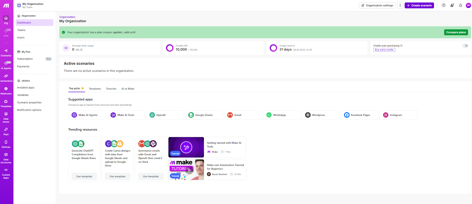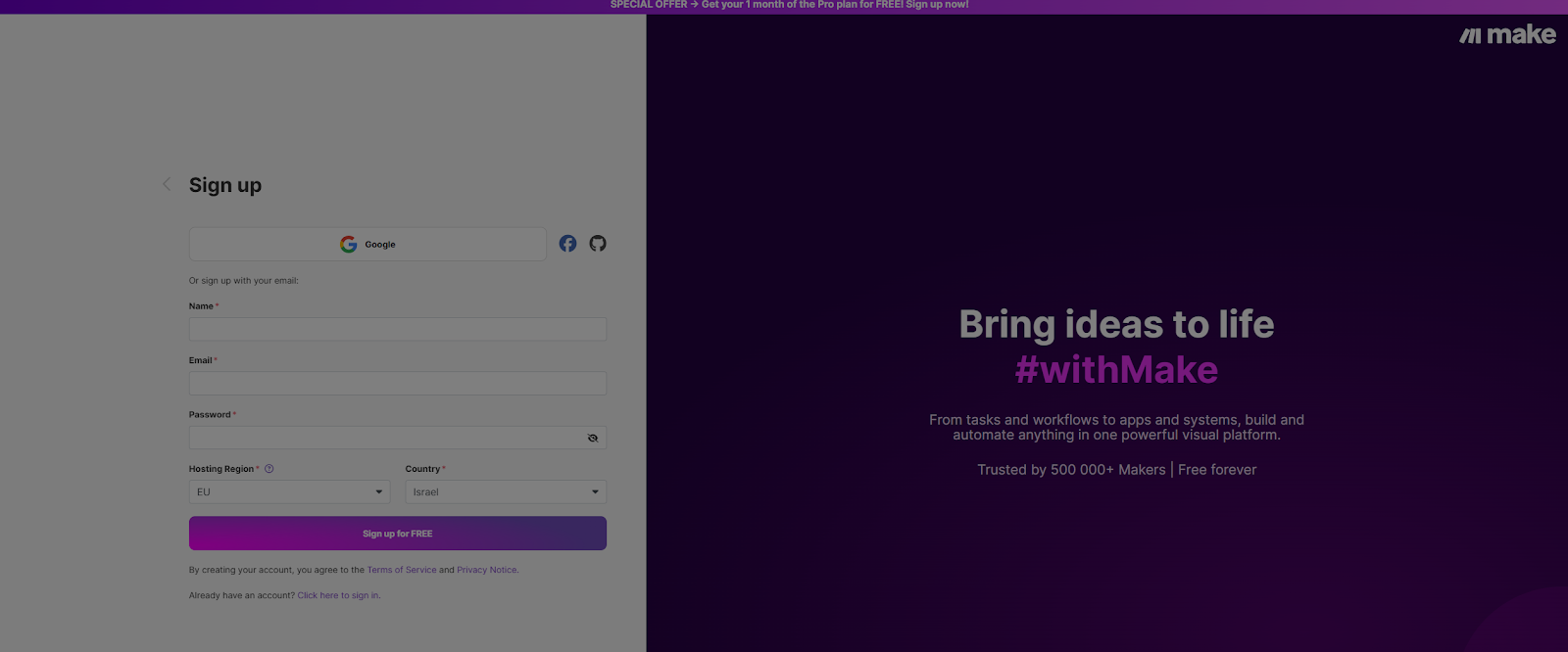 1.פתיחת חשבון: רישום מהיר ופשוט למערכת. MAKE מציעה תוכנית חינמית שמספיקה לרוב המשתמשים המתחילים וכוללת עד 1,000 פעולות ו-2 תהליכים פעילים, ויש מסלולים בתשלום לפי שימוש.