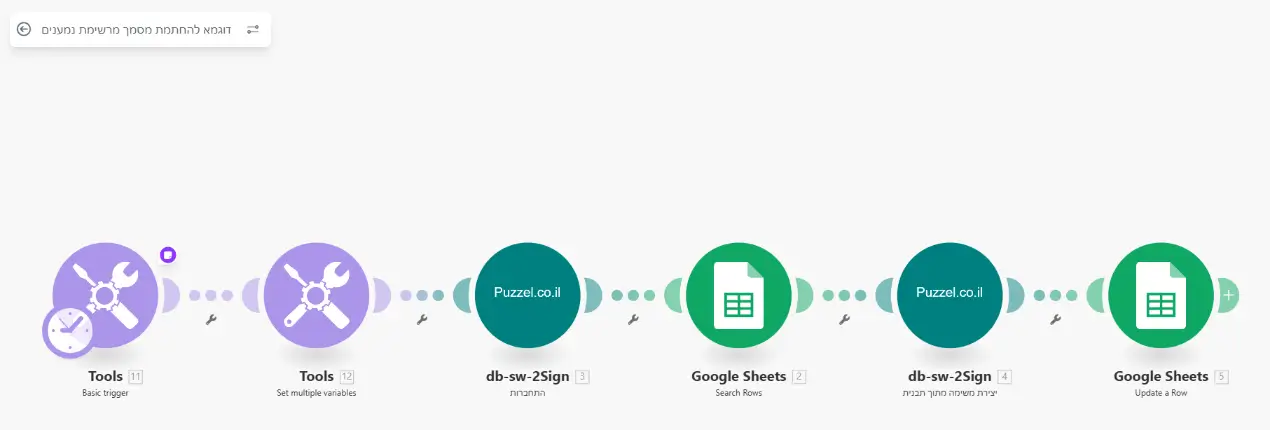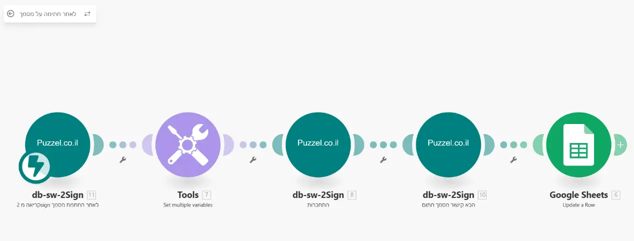 תרחיש זה יכול לעבור על כל הרשומות בגוגל שיטס ולשלוח מסמך לחתימה, לרבות הוספת לינק למסמך המיועד לחתימה בקובץ בגוגל שיטס.